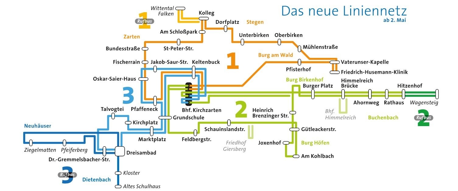 Neu ist die Linie 1 ab/an Bahnhof Kirchzarten über über Burg am Wald, Friedrich-Husemann-Klinik, Ober- und Unterbirken, Stegen Dorfmitte, Kolleg, Wittental/Falken (Rufbus) und Zarten. Auch diese Linie fahren wir in wechselnder Fahrtrichtung, viermal am Tag. Der Einkaufstour von Oberbirken nach Stegen Dorfmitte steht so nichts mehr im Weg.